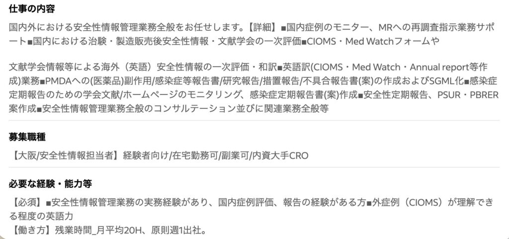 こちらも、医薬品の安全性関連ので正社員のお仕事です。