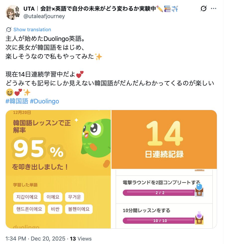 私は、Duolingoで韓国語を中心に取り組んでいます。