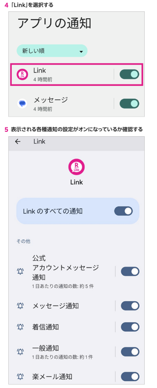 通知をONにする方法(楽天Linkの着信が鳴らない場合)